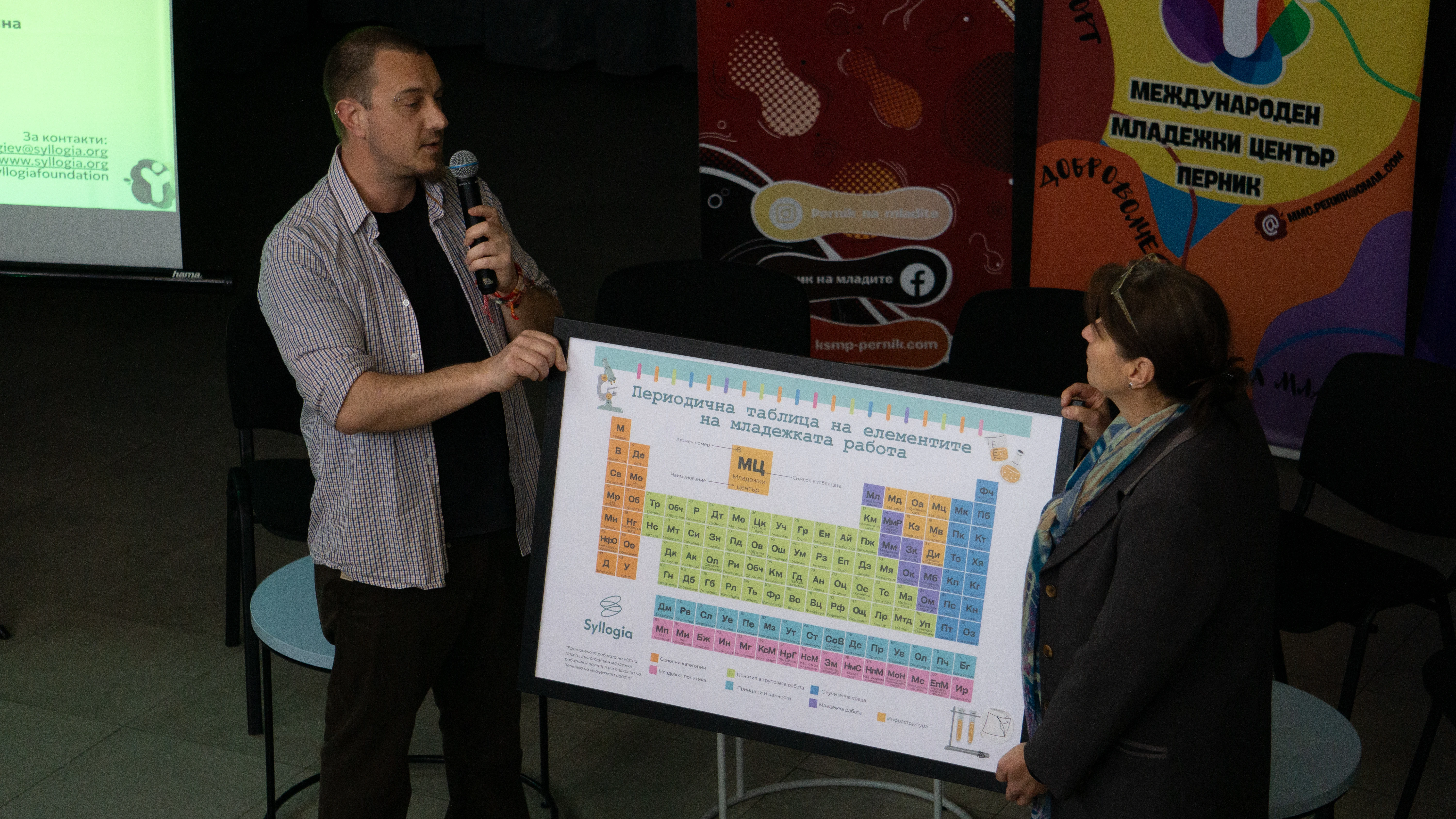 По тези поводи екипът на фондация Силогия подари на екипа на Международния младежки център Перник своята авторска „Периодична таблица на елементите на младежката работа“, като пожела на колегите постоянство и енергия в поддържане на усилията по разпознаване на целия сектор на местно и национално ниво.